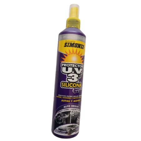 SIMONIZ® PROTECTOR U.V.3® es la única fórmula que mejora la apariencia y previene contra los efectos de los dañinos rayos del sol. Penetra en las superficies de vinilo, caucho, plástico y cuero, proporcionando una poderosa barrera protectora, que revitaliza el color original y da un acabado como nuevo. La barrera protectora de UV3 silicona, protege las superficies de la resequedad, decoloración y agrietamiento.